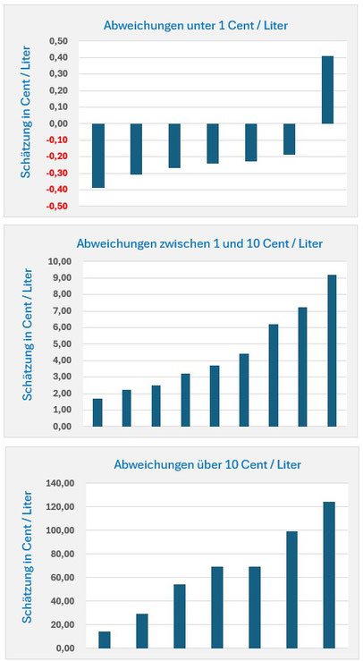 Nach bestandenem (oder nicht bestandenem) Test haben wir die Teilnehmerinnen und Teilnehmer gebeten, den Preis für einen Liter Wennigser Leitungswasser zu schätzen und anschließend den für einen Liter Abwasser. Erwartungsgemäß fiel das Ergebnis nicht so positiv aus wie beim Geschmackstest. Weil die Spreizung sehr groß war, haben wir das Ergebnis für die Summe Trinkwasser plus Abwasser (einschließlich Grundgebühr) in drei separaten Grafiken dargestellt.