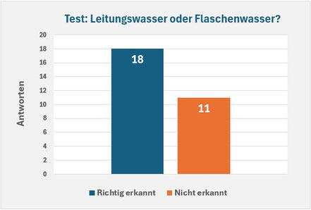 Die Balkengrafik zeigt das Ergebnis: Die Mehrzahl der Besucherinnen und Besucher hat richtig gelegen. Es war aber interessant zu beobachten, dass viele Testpersonen angegeben haben, überwiegend das Wennigser Leitungswasser zu trinken - und es dann auch richtig erkannt haben.