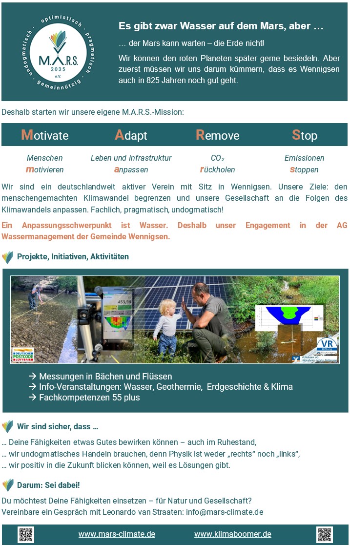 Im Rahmen der Feier zum 825jährigen Bestehen der Gemeinde Wennigsen war der Verein M.A.R.S. 2035 mit einem Stand vertreten. Ausgestellt wurde ein Regenwasserbehälter aus der Aktion "Volle Kanne" des Hannoverschen Vereins Ökostadt e.V. Außerdem sind wir mit Hilfe eines "Wassertests" mit vielen Standbesuchern in einen Austausch über unser "Adapt-Thema" Wasser gekommen.